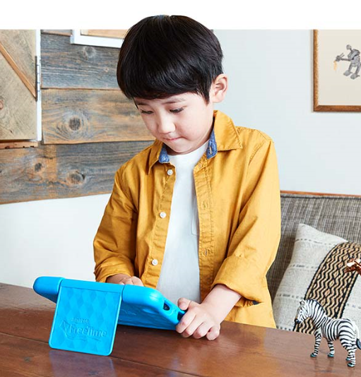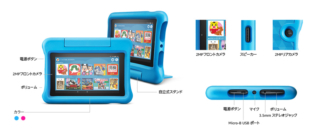 2019/06/30 Category : おすすめ商品 お子様が楽しみながら学べる、キッズ向けタブレット新登場! お子様が楽しみながら学べる、キッズ向けタブレット。7インチサイズがスタンド付きで新登場。 Fire 7 タブレット キッズモデル ブルー (7インチディスプレイ) 16GB 数千点の子ども向けコンテンツが楽しめるAmazon FreeTime Unlimitedが1年間使い放題(期間終了後は有料期間に自動更新)、キッズカバー、2年間の限定保証込み(2年間限定保証には一定の条件が適用されます)だからお子様にぴったり。 「ディズニー」や「セサミストリート」、「英検リスニングマスター」などの英語学習用のアプリや「ハリーポッター」などの英語の本・絵本、ビデオも楽しめるので英語の勉強にも適しています。辞書機能付きなので、英語の物語を読んでいる時にわからない単語があっても、簡単に調べることができます。Fire 7 タブレット キッズモデル ブルー (7インチディスプレイ) 16GB